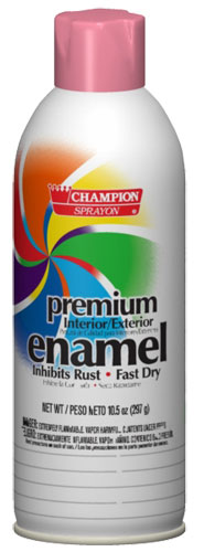Champion Sprayon® Premium Enamel offers a broad range of colors and finishes. This multi-purpose, interior/exterior enamel dries quickly, provides excellent coverage and durability, and resists chipping and peeling. The line includes three finishes in black and three in white, four different metallic shades, a clear coat, and 15 colors in various finishes.