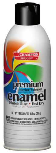 Champion Sprayon® Premium Enamel offers a broad range of colors and finishes. This multi-purpose, interior/exterior enamel dries quickly, provides excellent coverage and durability, and resists chipping and peeling. The line includes three finishes in black and three in white, four different metallic shades, a clear coat, and 15 colors in various finishes.
