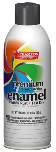 Champion Sprayon® Premium Enamel offers a broad range of colors and finishes. This multi-purpose, interior/exterior enamel dries quickly, provides excellent coverage and durability, and resists chipping and peeling. The line includes three finishes in black and three in white, four different metallic shades, a clear coat, and 15 colors in various finishes.