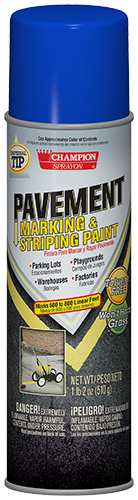 Champion Sprayon® Pavement Striping Paint is designed for striping asphalt, concrete or other paved surfaces. The discharge valve sprays only in a downward position. The universal tip fits all machines. Use it with a Champion Sprayon Paint Striper. Stripes 600-800 linear feet. Now toluene free; won't harm grass.