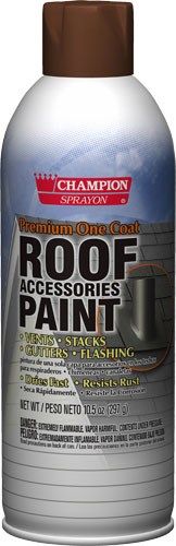 Champion Sprayon® Roof Accessories Paint is a one-coat, rust-resistant spray that camouflages and protects gutters, flashing, vents, soil stacks and other roof accessories.