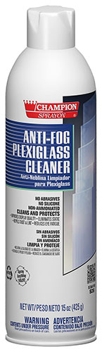 Champion Sprayon® Anti-Fog Plexiglass Cleaner makes cleaning easier and faster. Leaves a protective coating that repels dirt, dust, finger smudges, scratches and water spots. Contains no abrasives or silicones.