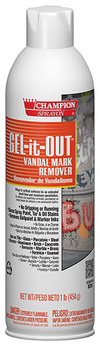 Champion Sprayon® GEL-it-OUT™ heavy-duty gel vandalism remover clings to vertical surfaces without dripping or running. Washes away with soap and water.