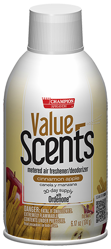 Champion Sprayon® ValueScents completely eliminate unpleasant odors and leave a clean, fresh scent in the air. Contains Ordenone®, a deodorizing ingredient that is an effective odor eliminator. The measured spray deodorizes up to 6,000 cubic feet. Universal spray tip.