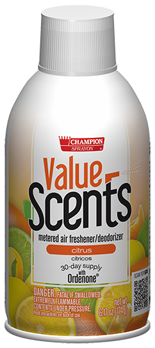 Champion Sprayon® ValueScents completely eliminate unpleasant odors and leave a clean, fresh scent in the air. Contains Ordenone®, a deodorizing ingredient that is an effective odor eliminator. The measured spray deodorizes up to 6,000 cubic feet. Universal spray tip.